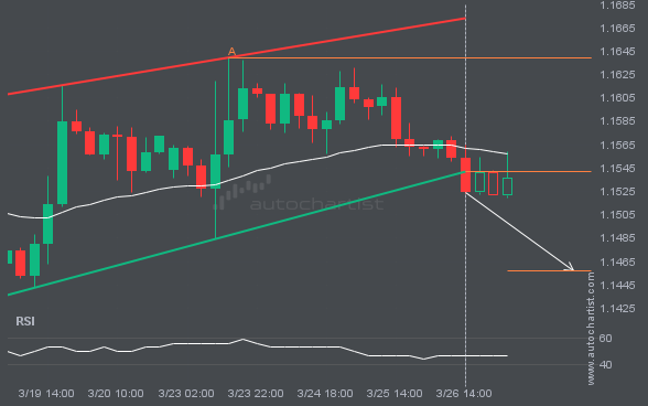 USDJPY has broken through the resistance line of a Triangle technical chart pattern. Because it has retraced from this line in the past, you should wait for confirmation of the breakout before taking any action. It has touched this line twice in the last 10 days, which suggests a possible target around 160.0510 within the […]