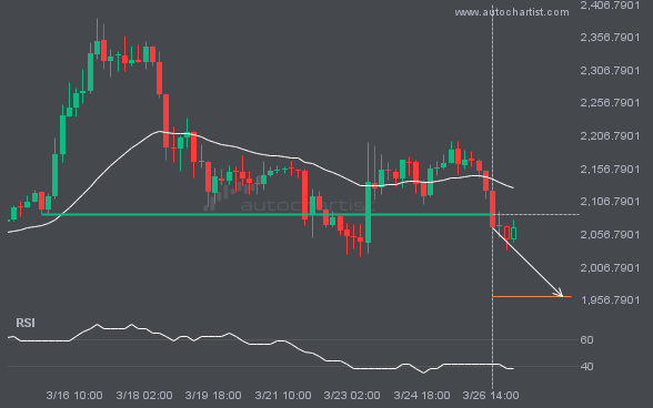 ETHUSD has broken through a line at 2087.0801. If this breakout holds, we could see the price of ETHUSD move toward 1962.2170 within the next 3 days. However, don’t be too quick to trade. It has tested this line many times in the past, so confirm the breakout before placing any trades.