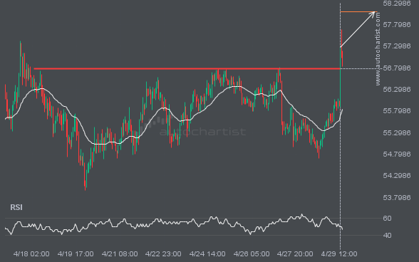 BRN/USD has moved through the support line of a Rising Wedge pattern at 110.23942857142858 on the 4 hour chart. This line has been tested multiple times in the past, and this breakout could signal an upcoming change in the current trend. Price may continue in the current direction toward 106.8749.